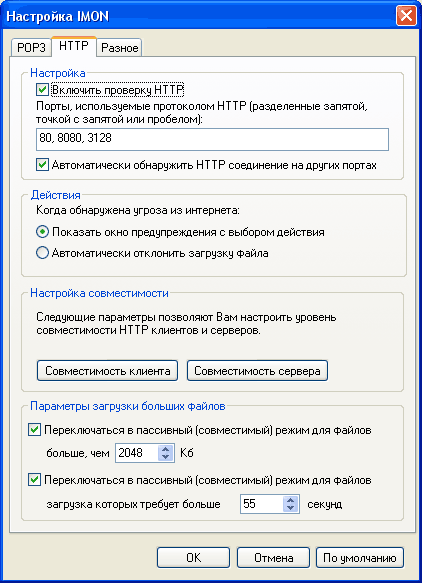 HTTP – это протокол, который используется при работе с интернетовскими страничками. Со страничек также могут исходить различные угрозы – файлы, зараженные вирусами, трояны, вредоносные скрипты, – и данный монитор может обнаруживать и блокировать попытки вторжения и заражения. Здесь, в общем, по умолчанию все настроено правильно, вам может потребоваться только подкорректировать параметры загрузки больших файлов в зависимости от скорости вашего соединения с Интернетом.