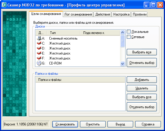 2. Запуск NOD32. Запуск сканера с возможностью выбора объектов для сканирования.