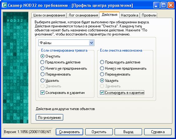 Рекомендуется выставить параметры так, как на скриншоте. Этот вариант действий позволяет, во-первых, не мучить вас лишними вопросами, а во-вторых, все излеченные, а также удаляемые в случае невозможности излечить файлы будут на всякий случай копироваться в карантин, откуда их при необходимости можно будет достать. Впрочем, практика показывает, что если уж NOD32 не смог очистить файл от вируса, то этот файл лучше всего похоронить и забыть о нем навсегда.