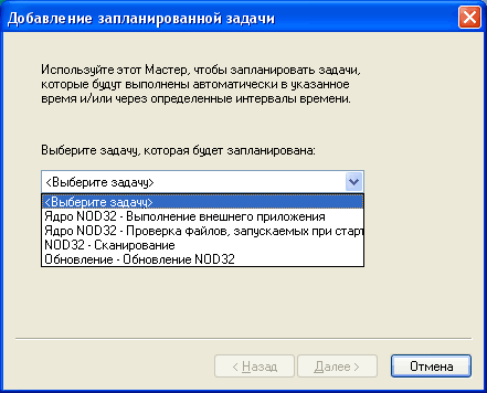 Здесь можно, во-первых, посмотреть, какие именно задачи уже запланированы в результате различных установок, а во-вторых, можно добавлять, редактировать и удалять новые задачи. Причем планировщик задач в NOD32 – достаточно мощный и не ограничивается только сканированием компьютера. Если нажать кнопку «Добавить», перед вами появится следующее окно: