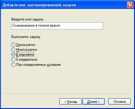 Выбираем «NOD32 – Сканирование» и нажимаем «Далее». Появляется окно, в котором задаче нужно дать имя и указать, как ее выполнять:
