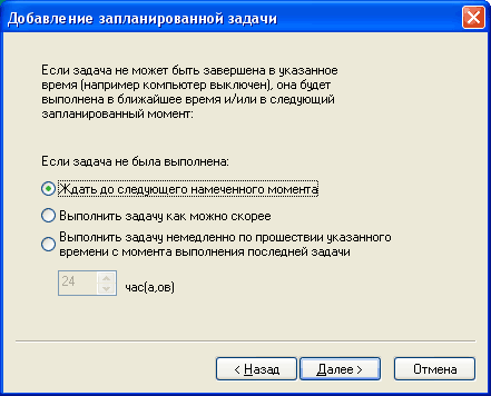 Далее задается время старта задачи, а потом указывается, что делать, если задача не будет по каким-то причинам выполнена:
