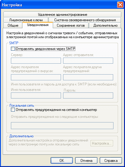 Одна из очень полезных возможностей NOD32 – возможность отправки уведомлений о сигналах тревоги и различных важных событиях удаленному администратору: по электронной почте или по локальной сети. Для чего это может быть полезно? Например, вы поставили этот антивирус на компьютер своего знакомого – полного чайника. Включили там тихий режим, чтобы NOD32, как говорится, защищал, но не выступал. При этом вам хотелось бы знать, что там на компьютере происходит, подвергается ли он атакам вирусов и прочей дряни. Так вот, с помощью этой настройки вы можете заставить NOD32 отправлять соответствующие сообщения на ваш электронный адрес (или по сети). Пользователь-чайник никаких раздражающих его воплей от антивируса получать не будет, а вы будете в курсе, что у него происходит.