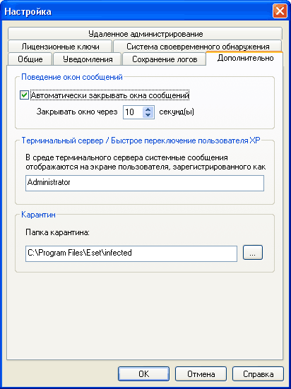 Ну и на этой вкладке вы можете задать поведение окон сообщений (автоматическое закрытие их через заданное число секунд – вполне полезная опция), а также указать расположение папки карантина (ну или просто посмотреть, где ее искать в случае чего).