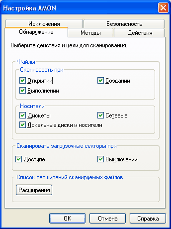 Здесь, в общем-то, лучше ничего не менять. По умолчанию монитор будет проверять файлы при их открытии, выполнении и создании на всех носителях – дискеты, локальные диски и носители, сетевые диски и носители. Если монитор будет заметно тормозить систему, тогда оставьте сканирование только дискет и сетевых устройств. Также имеет смысл нажать кнопку «Расширения» и там снять отметку с опции «Сканировать все файлы» – после этого антивирус будет сканировать не все файлы вашего компьютера, а только те, которые могут подвергнуться заражению. Это также уменьшит торможение работы компьютера из-за постоянно запущенного монитора.