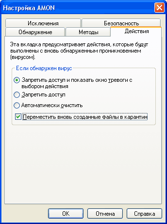 Здесь задаются действия, которые антивирус будет производить при обнаружении угроз. При работе в штатном режиме лучше задавать вывод окна тревоги с возможностью выбора действий. При этом рекомендуется отметить опцию «Переместить вновь созданные файлы в карантин», чтобы в специальной папке под названием «Карантин» сохранились те зараженные файлы, которые вы приказали удалить, – ну, мало ли что, на всякий случай.