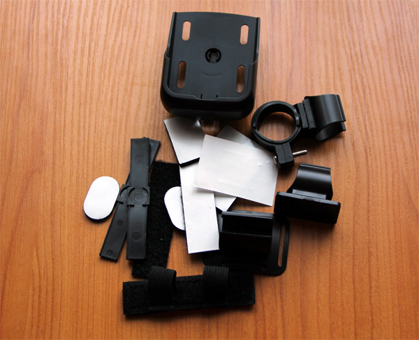 Для крепления трубки камеры здесь предусмотрено штук пять различных вариантов: пластиковые держатели, матерчатые держатели, разнообразные двухсторонние липучки.