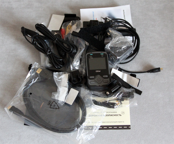 Вот все, что входит в комплект: сам регистратор, выносная камера, выносной микрофон, крепление на штангу, крепление на поверхность стекла, крепление на шлем, фиксаторы на липучках, кабель HDMI, кабель USB, сетевой адаптер, адаптер прикуривателя, прерыватель для прикуривателя, проводное дистанционное управление, чехол, пластиковый бокс на регистратор, аккумулятор.