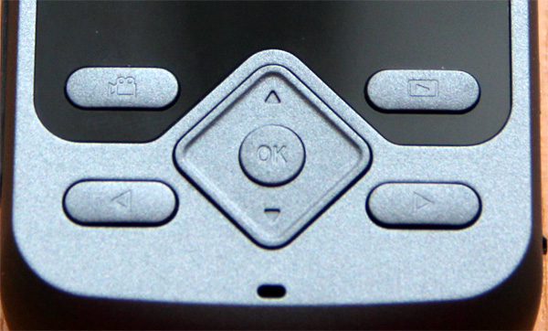 На передней панели - двухпозиционный джойстик с кнопой "ОК" и еще четыре кнопки: запись, влево, воспроизведение, вправо.