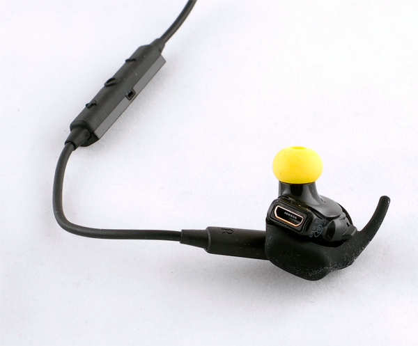 Зарядка гарнитуры производится через порт microUSB, расположенный под резиновой насадкой с "рожком" правого наушника. Насадку нужно просто сдвинуть - обнаружится порт, к которому подключается кабель USB-microUSB. (Кстати, входящий в комплект кабель - довольно короткий.)