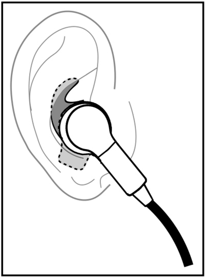 Этот "рожок" и нижний выступ окантовки должны обеспечивать дополнительное крепление наушника в ухе так, чтобы он не выпал даже при самых активных нагрузках.
