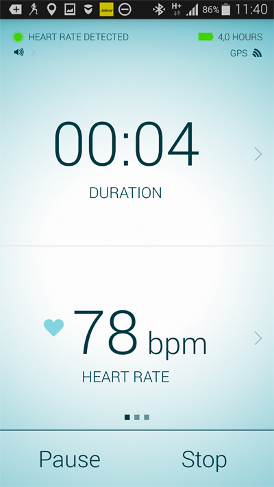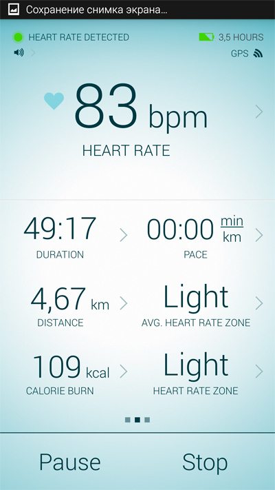 Сердечный ритм гарнитура отслеживает непрерывно и его выводит. Также вам показывают оставшееся время работы от аккумулятора и статус GPS. Кстати, реальное время работы может быть заметно больше - там показывают прогноз при максимальной загрузке.