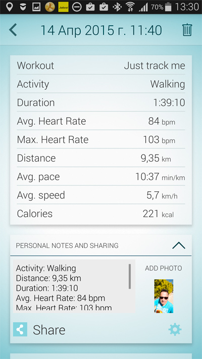 Ну и в третьем окне выводится подробный набор данных по вашей активности: время, пройденное расстояние, сожженные калории (программа их считает как-то странно) и так далее.