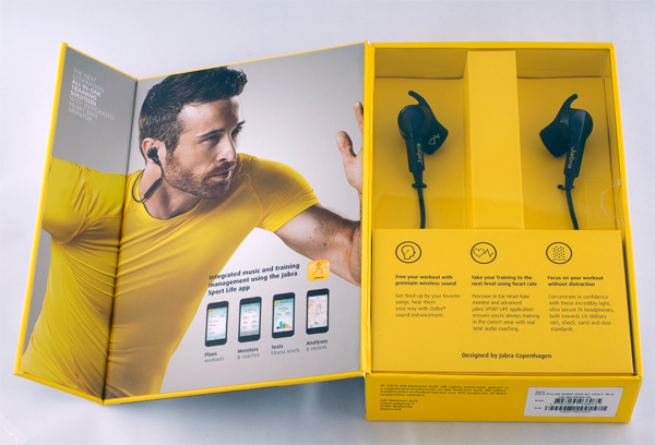 Традиционно для Jabra стильная и качественная упаковка, на обложке которой изображена волевая и сильная женщина, которая не пьет, не курит, не принимает наркотики, а вместо этого занимается спортом. А когда бездельник-муж ей что-то бухтит на ухо - сильная женщина вставляет в уши Jabra Sport, пульсирует в нее своим горячим сердцем и понимает, что с этим гаджетом она выдержит все что угодно! Кстати, при необходимости этим гаджетом подлого мужа можно и удушить, но мы понимаем, что такая женщина не пойдет на нарушение закона: она разведется с мужем на совершенно законных основаниях или же прихлопнет его дверью.
