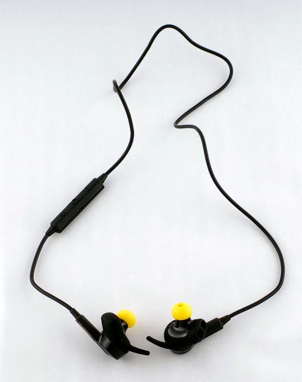 Тот самый стиль оформления, о котором я говорил: наушники-затычки соединены тоненьким проводком с небольшим пультом управления. Больше ничего нет: аккумулятор, датчики, пульсометр - все внутри наушников.