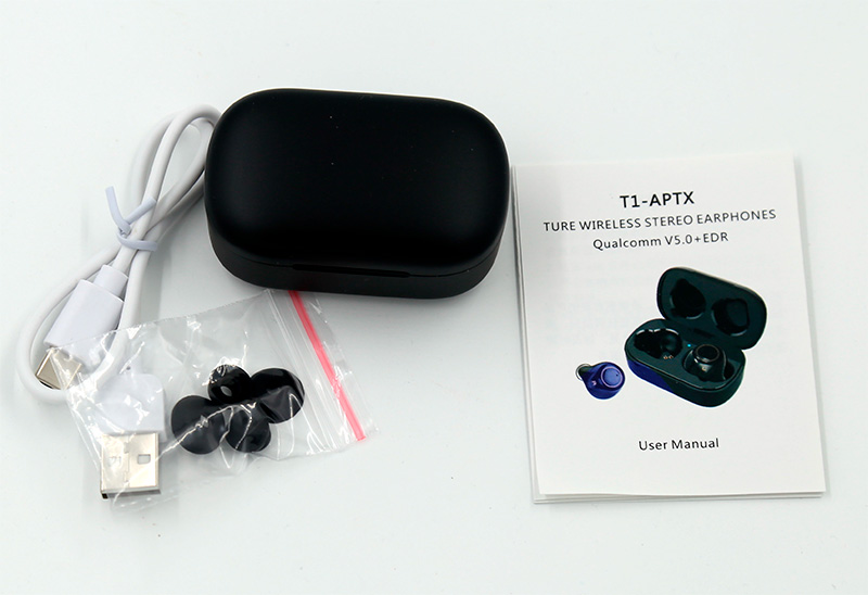 Внутри: зарядный кейс, наушники, три комплекта амбушюр разных размеров, зарядный кабель, инструкция на английском и китайском.