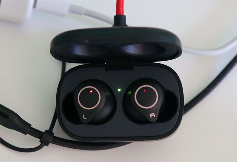 Оба наушника имеют по светодиоду, показывающих зарядку, режим спаривания и работу в обычном режиме. Индикация зарядки кейса находится под крышкой. Уровень заряда наушников и кейса увидеть нельзя - соответствующих индикаторов нет.