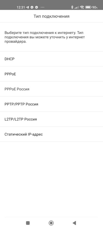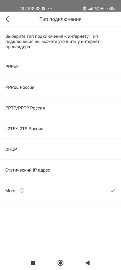 Выбираем тип подключения для первичной настройки. При первичной настройке режима мост (Bridge), чтобы иметь выход во внутреннюю локальную сеть, нет, но тогда сначала нужно выбрать DHCP, а когда все будет настроено, в типе подключения появится режим "Мост". Заметьте, что в некоторых подобных системах режима "Мост" вообще нет: роутеры просто создают свою собственную беспроводную сеть для Интернета, и из нее нет выхода в локальную сеть.