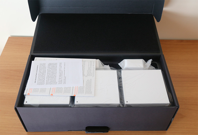 Комплект поставки: три роутера/сателлита (они совершенно одинаковые и взаимозаменяемые) с блоками питания, руководство пользователя, гарантийный талон и кабель Ethernet для подключения основного устройства к Интернету.