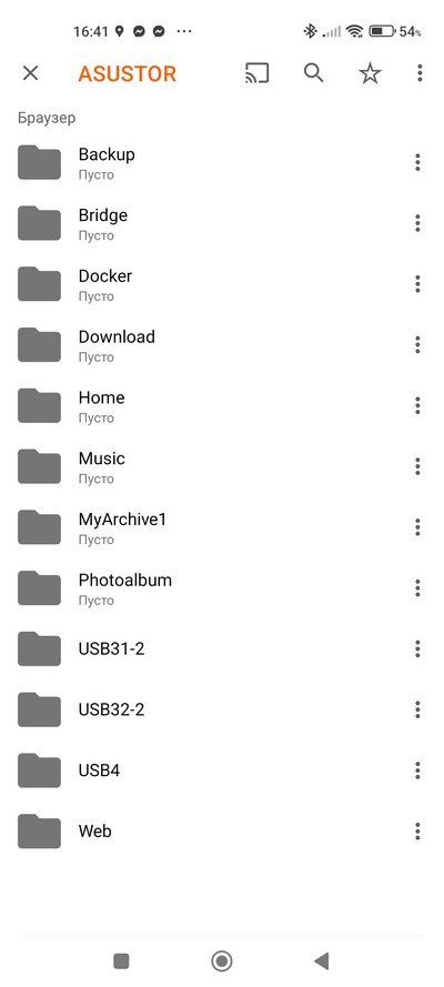 Проверил работу в режиме моста: да, с любого устройства можно иметь доступ к домашнему NAS локальной сети - вот папки на NAS ASUSTOR.