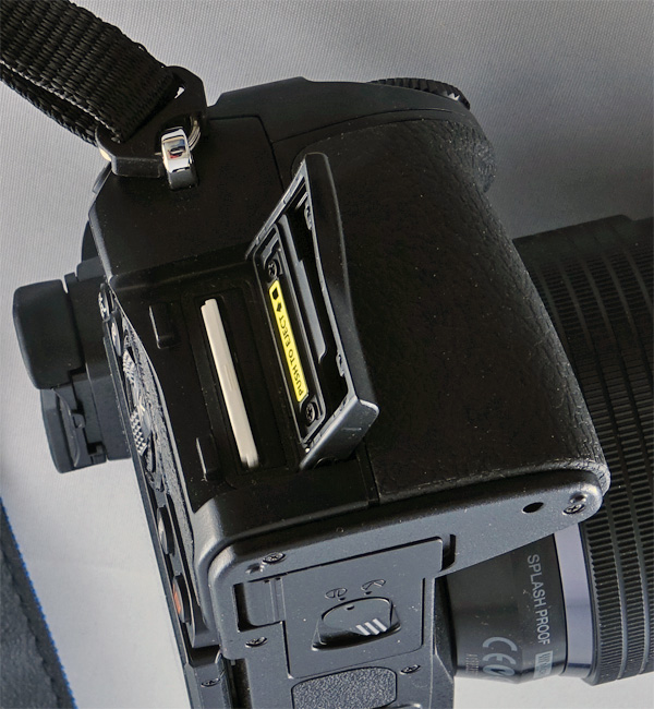 И тут важный момент - обратите внимание на выступ под хват правой рукой. Он достаточно большой и удобный, камера в руке лежит очень неплохо. Не супер, но намного лучше, чем у E-M5, где был малюсенький выступ впереди и небольшой выступ под большой палец сзади. Та камера в руке лежала скорее плохо. Здесь - совсем другое дело, держать E-M1 удобно.