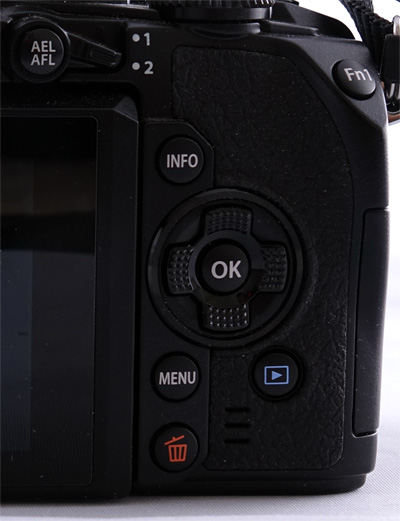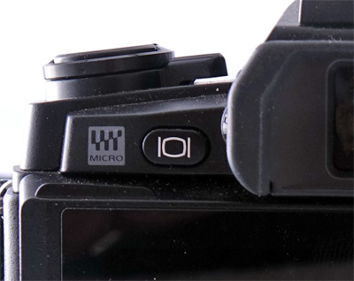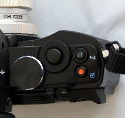 На верхнем торце справа: кнопка спуска затвора, снабженная зубчатым колесом; второе зубчатое колесо без центральной кнопки; кнопка режимов съемки с кнопкой-фиксатором; функциональная кнопка 2 (на нее можно навесить различные действия); кнопка съемки видео, расположенная вполне удачно - случайно она не нажимается. На скошенном торце - функциональная кнопка Fn1.