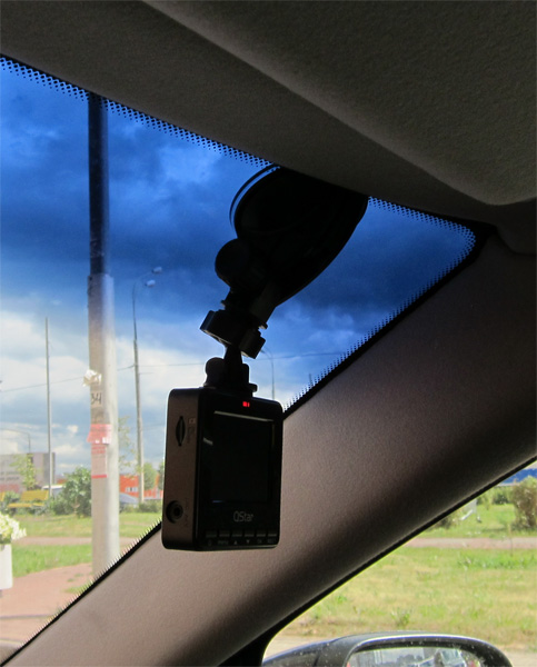 У меня вот так был установлен этот видеорегистратор для съемки. При этом затемненная часть стекла в кадр не попадает, а сам видеорегистратор снаружи практически не виден.