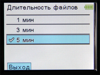 Длительность файлов при цикличной записи 3-5 мин