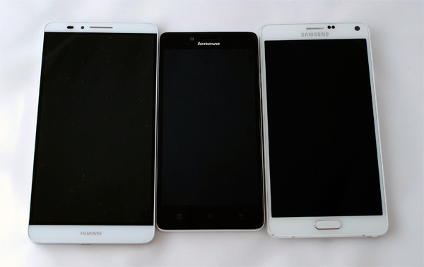 Вот наш герой рядом с Huawei Ascend Mate 7 и Samsung Galaxy Note 4.