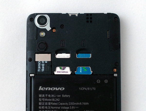 Крышка легко снимается, под ней обнаруживаются съемный аккумулятор, слот для карты памяти microSD и два слота для сим-карт microSIM.