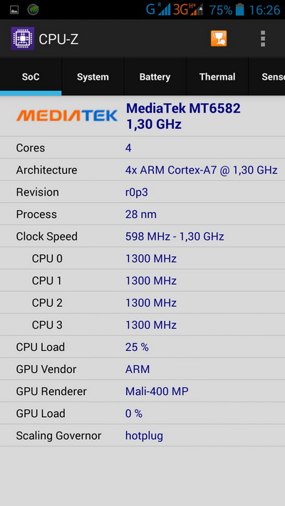 Процессор: MediaTek MT6582, 4 × 1300 МГц