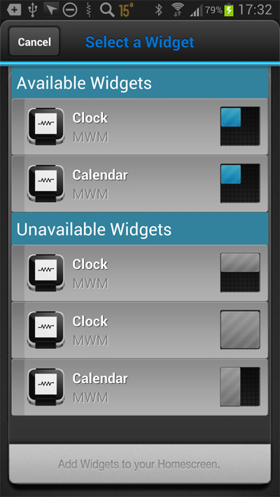 Однако виджетов здесь - котейка нарыдал. Собственно, в андроидном варианте их всего два - время на три варианта (четверть квадрата, половина и целый) и календарь на два варианта (четверть и половина). Вот и все виджеты.