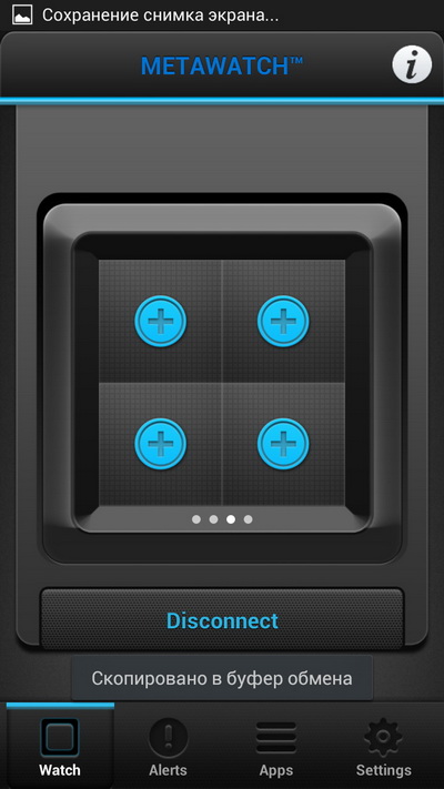 Для подключения надо на часах включить Bluetooth (в первый раз потребуется сделать обычное сопряжение) и на смартфоне включить Bluetooth. После этого вы увидите десктопы часов (их четыре штуки), на которых можно размещать всякие виджеты, для чего там присутствуют пиктограммы с плюсиками.