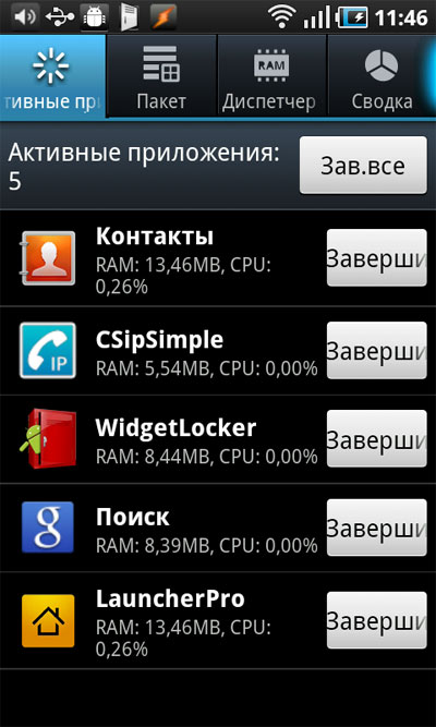 Также в системе предусмотрен просмотр запущенных служб (виджеты, сервисы), которые можно вручную останавливать.