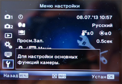 На самом деле самое главное меню - вот это, пользовательское, потому что здесь можно настраивать действия кнопок, функциональных кнопок (даже кнопки "Спуск") и колес - практически как угодно. У этого фотоаппарата чрезвычайно гибкие возможности настройки под пользователя - это нельзя не приветствовать.
