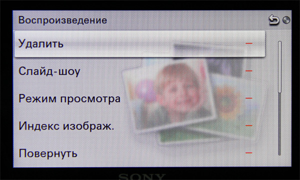Удаление, слайд-шоу, выбор объекта просмотра (фото, видео, звук), индекс изображений (количество предпросмотров - 6 или 12), поворот, защита от удаления, 3D-просмотр (для телевизора), параметры громкости, параметры печати, вид экрана.
