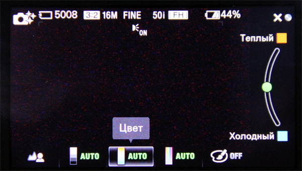 Для автоматических режимов кнопкой "ОК" вызывается корректировка соотношения выдержка - диафрагма (зубчатым колесом регулируется диафрагма для увеличения глубины резкости), регулировка яркости, цветности (теплый и холодный оттенки), интенсивности цветов, задание всяких спецэффектов.