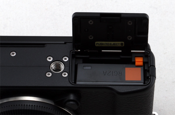 На нижней грани - отсек для аккумулятора и карты памяти, которую оттуда вытаскивать не слишком удобно: ее слот расположен очень близко к крышке, карту сложно ухватить.