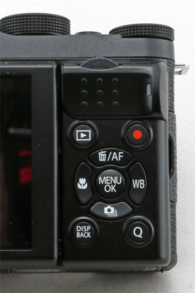 На задней части справа - второе управляющее зубчатое колесо. Оно еще и нажимаемое. Ниже - кнопка просмотра отснятого и кнопка включения видеозаписи. Далее идет селектор с четырьмя управляющими кнопками и кнопкой "Menu/OK". Селектором можно: выставлять область фокусировки при съемке и удалять файлы при просмотре, менять баланс белого, включать макросъемку, выставлять режим работы затвора.