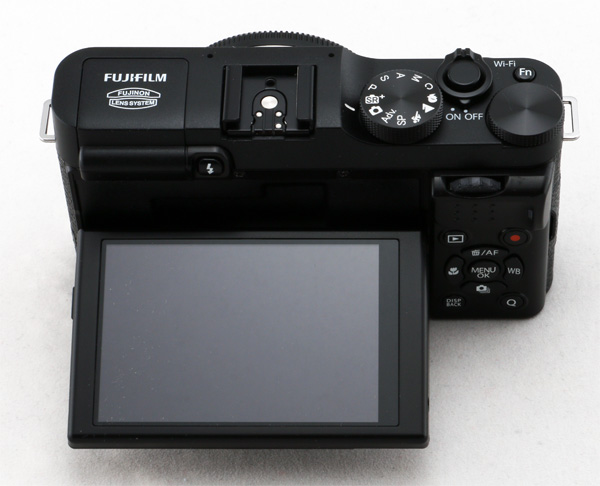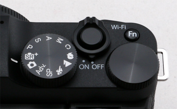 Верхняя группа управления: колесо режимов, кнопка спуска затвора с переключателем On/Off, большое зубчатое колесо, функциональная кнопка Fn, которая в режиме съемки по умолчанию настроена на параметр ISO, а в режиме просмотра включает функции Wi-Fi. Зубчатое колесо в режимах P, S, A, M изменяет компенсацию экспозиции.