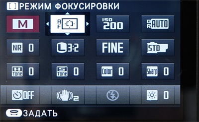 В режиме съемки здесь есть три вида вывода информации. Первый - минимальный: выдержка, диафрагма, ISO, компенсация. Рядом с соответствующими параметрами показывается, каким именно колесом параметр можно поменять: вертикальным или горизонтальным.