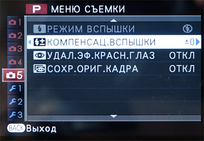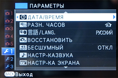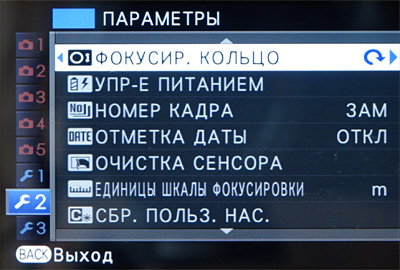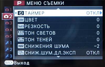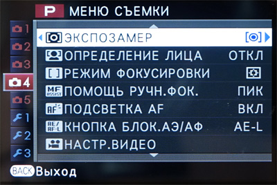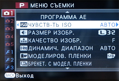 Меню фотоаппарата сделано достаточно грамотно и удобно. Слева идут вкладки меню съемок и настроек, справа на одном экране без скролинга - пункты настроек.
