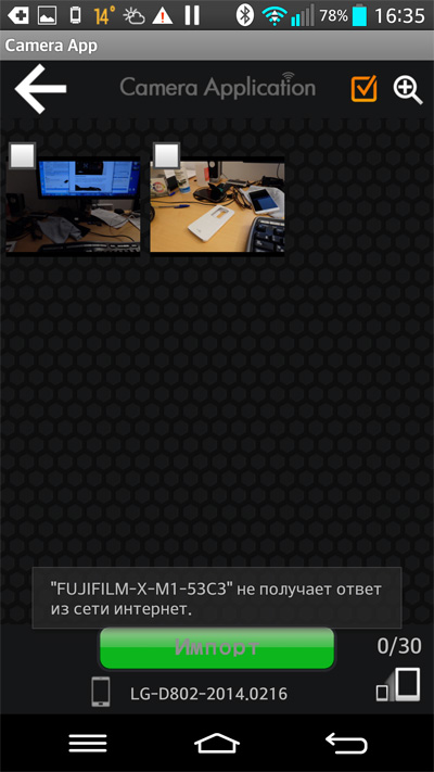 Но вот его мне подключить не удалось: смартфон все время писал, что соединение с камерой оборвалось, и дистанционно камерой управлять не захотел. При этом в том же приложении получение фотографий с камеры работало нормально.