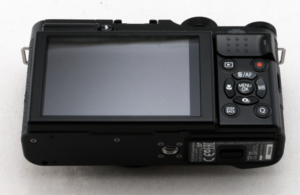 Задняя часть - дисплей, который может поворачиваться в вертикальной плоскости вверх-вниз, позволяя контролировать кадр с верхней и с нижней точек. Справа пластиковая накладка под большой палец с индикатором записи на карту. Она почему-то выполнена из гладкого пластика, так что тоже не очень удобная.