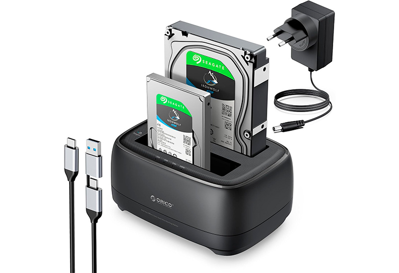 Простейший DAS - это одно- или двухдисковая (встречаются и трехдисковые) док-станция, подключаемая к ПК или ноутбуку через порт USB 3.0. Их выпускают самые разные производители, стоят они в районе €40 (ссылка для РФ). Такие устройства нередко имеют специальную кнопку, при нажатии на которую содержимое одного диска копируется на другой без подключения к компьютеру, также эти устройства почти всегда умеют переводить вставленные в них диски в спящий режим, при котором они почти не потребляют электроэнергию.