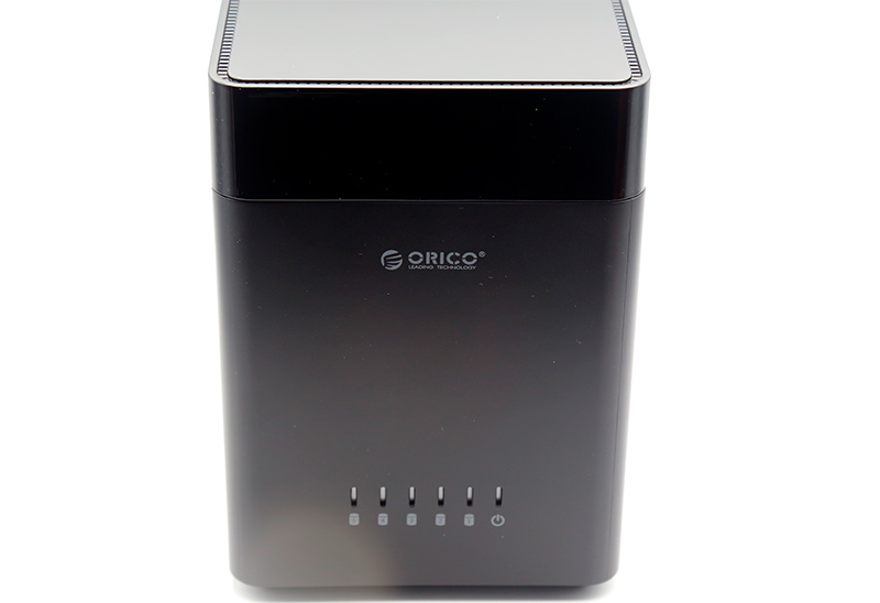 Передняя часть устройства. Внизу - шесть светодиодов: пять для соответствующих разделов под диски и шестой загорается при включении устройства.