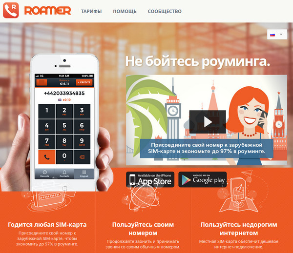 Сегодня мы рассмотрим новый интересный сервис Roamer (их сайт - roamerapp.com), который позволяет, находясь за границей, получать звонки на свой обычный номер телефона и совершать звонки со своего обычного номера телефона, причем платить при этом какие-то копейки - реальная экономия по сравнению с роуминговыми тарифами составляет почти 97%.