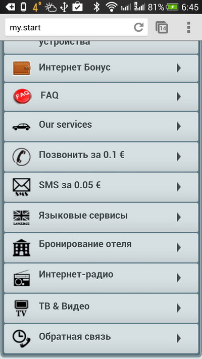 Стартовая страница сервиса предлагает и всякие другие услуги: заказ отелей-автомобилей, после чего определенный трафик предоставляется бесплатно, а также возможность за копейки звонить за границу и отправлять SMS-сообщения.