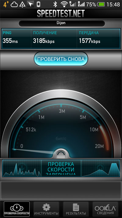 Однако в той же Франции, даже в дороге роутер нередко показывал и мегабит, и заметно больше - и это реально работало. Вот данные теста, которые я получил, включив роутер на виноградниках Шабли. И оно было очень похоже на правду.