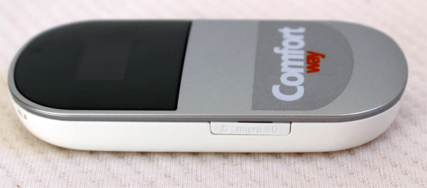 Слева - слот под microSD. В данном случае он практически никак не используется, но планируется в дальнейшем к использованию для хранения, например, корпоративных приложений - чтобы их не закачивать из Сети. Ну и, конечно, можно использовать вставленную в роутер карту как внешний накопитель при подключении роутера кабелем к компьютеру.